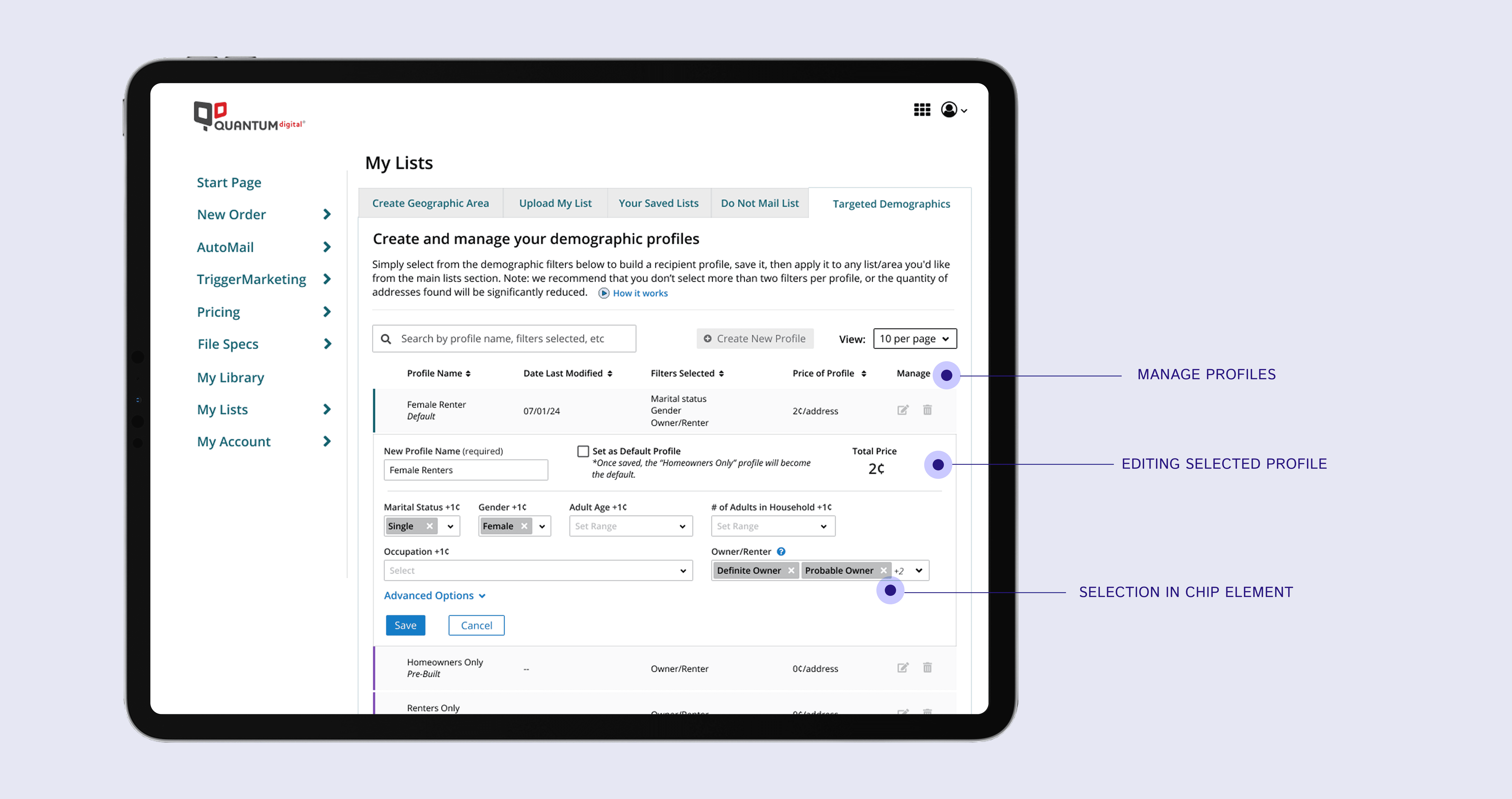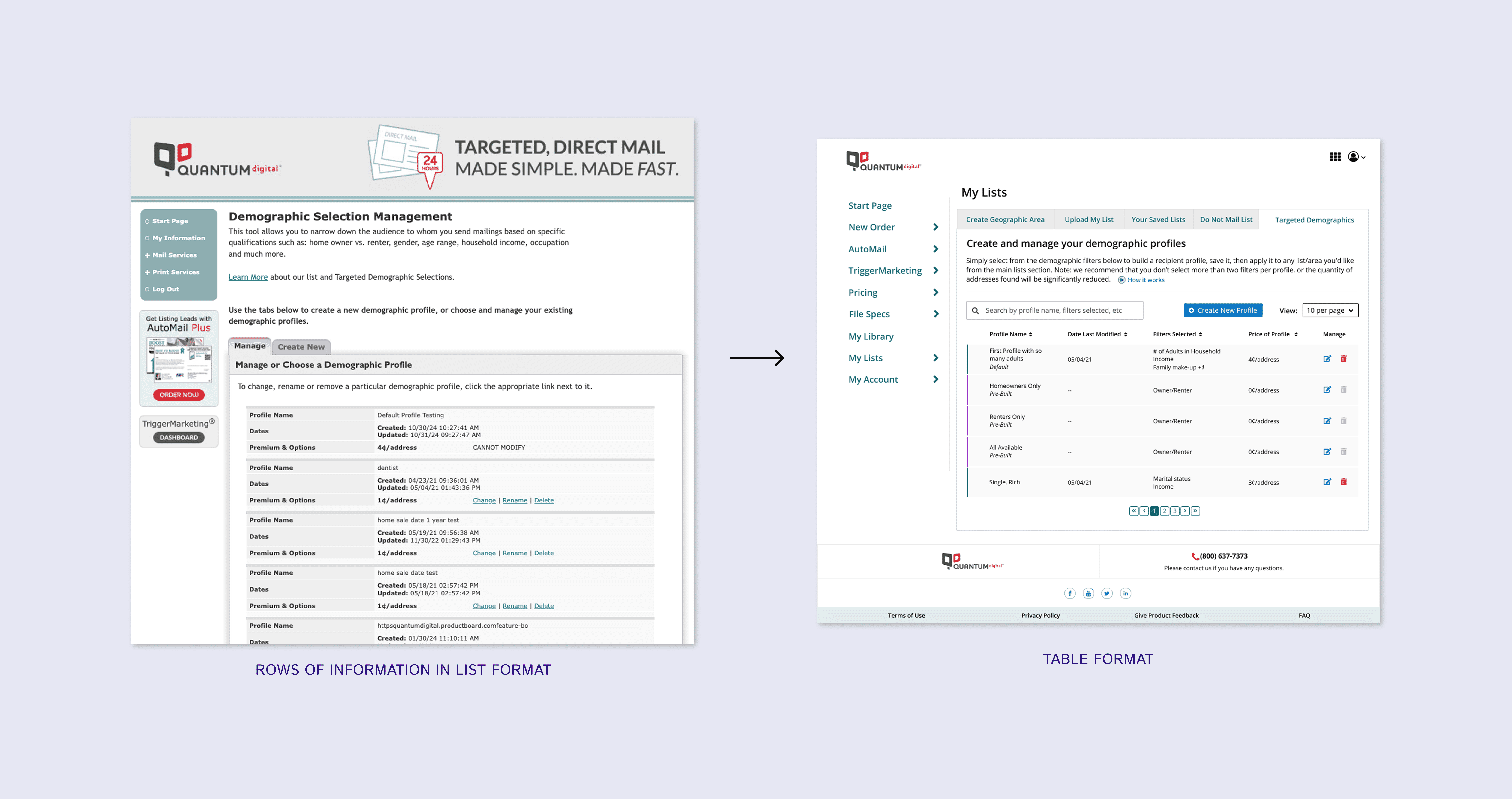 To support users’ primary tasks, we redesigned the Demographic Profiles experience around efficient management and quick profile creation.