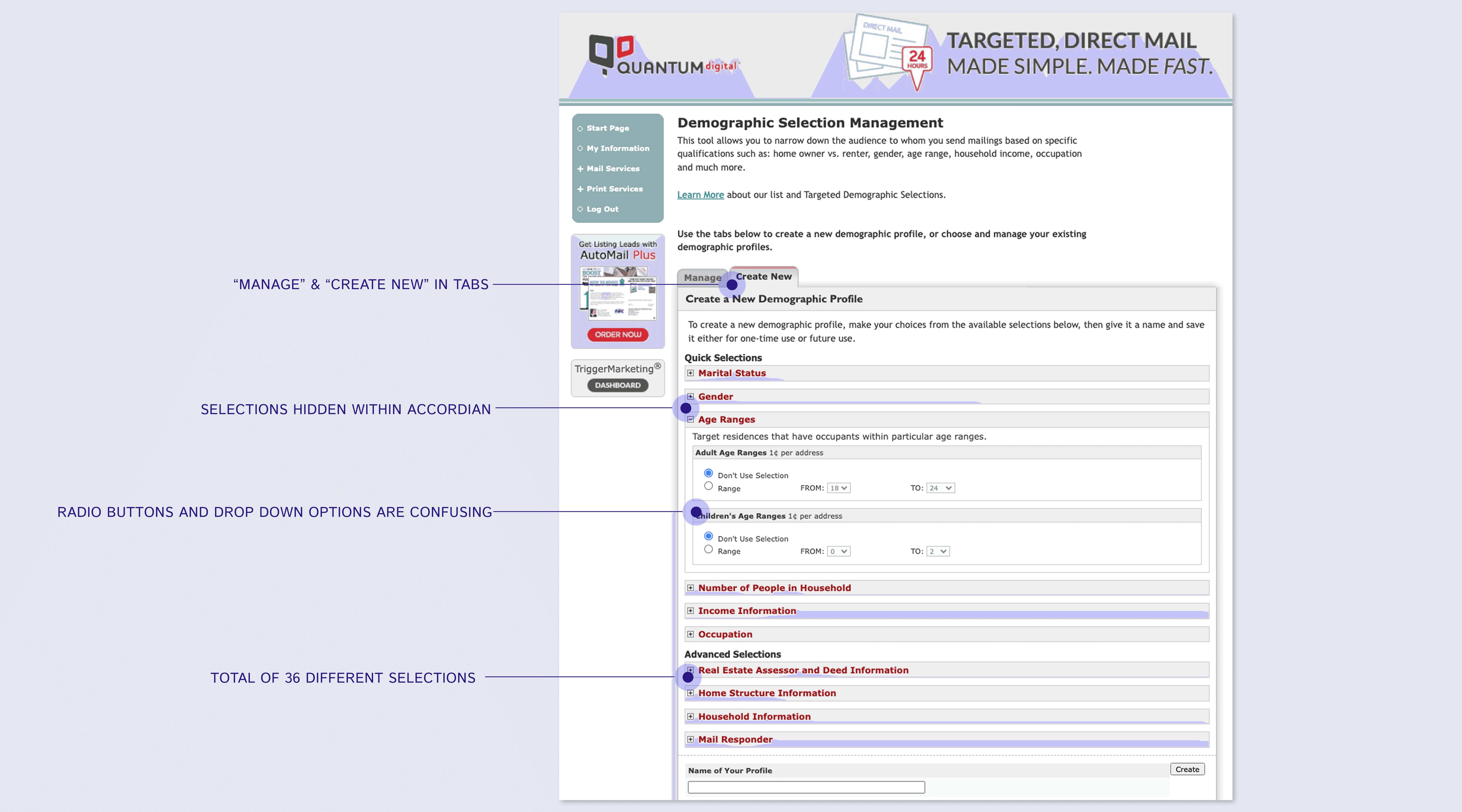We reorganized the List Management section by grouping all list tools together, including Targeted Demographics, under a single tabbed interface. This allowed users to navigate between tools without leaving the page, reducing clicks and cognitive load.